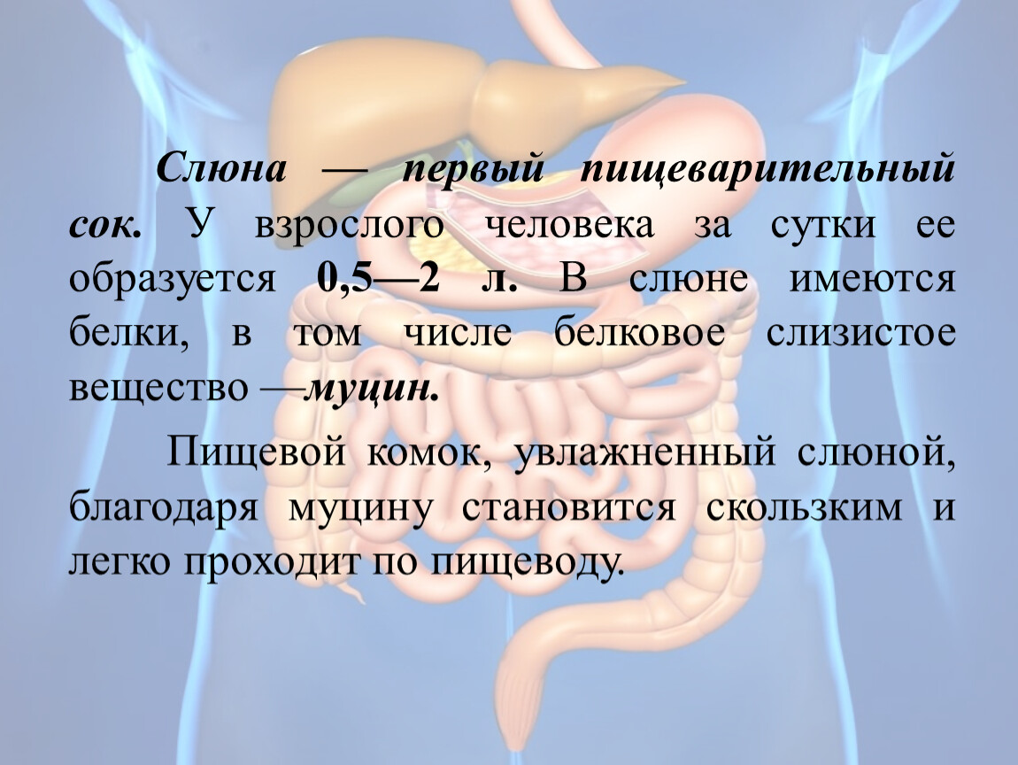 Слюна — первый пищеварительный сок. У взрослого человека за сутки ее образуется 0,5—2 л. В слюне имеются белки, в том числе белковое слизистое вещество —муцин.