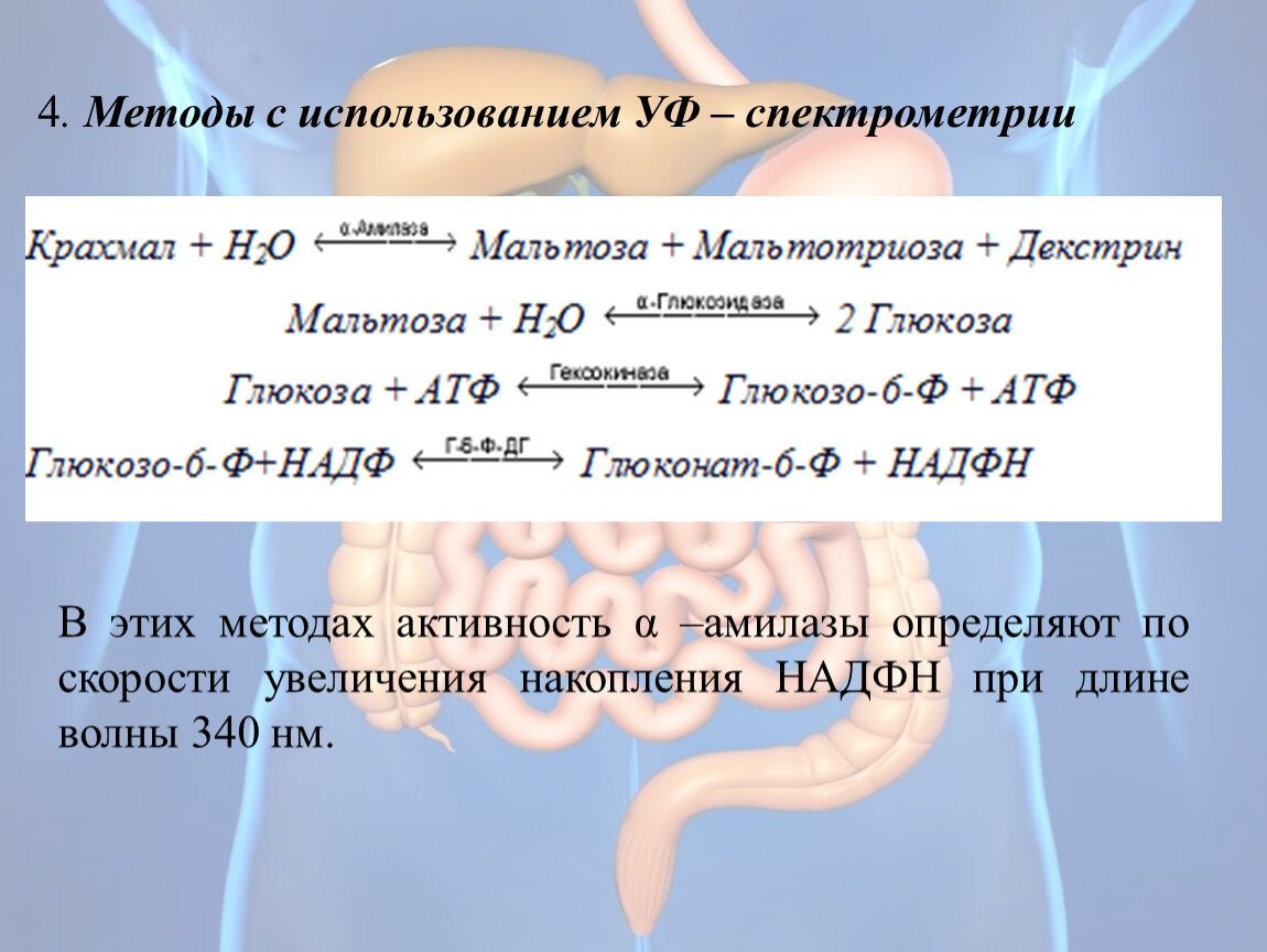 В этих методах активность α –амилазы определяют по скорости увеличения накопления НАДФН при длине волны 340 нм.