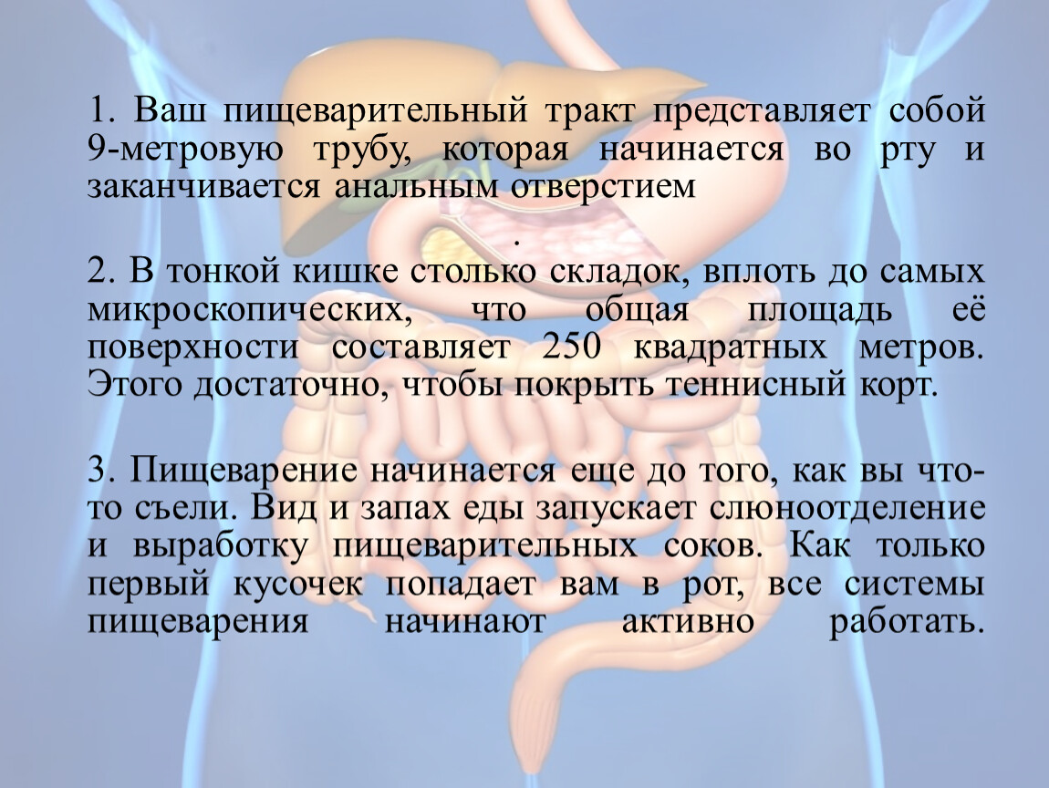 1. Ваш пищеварительный тракт представляет собой 9-метровую трубу, которая начинается во рту и заканчивается анальным отверстием
