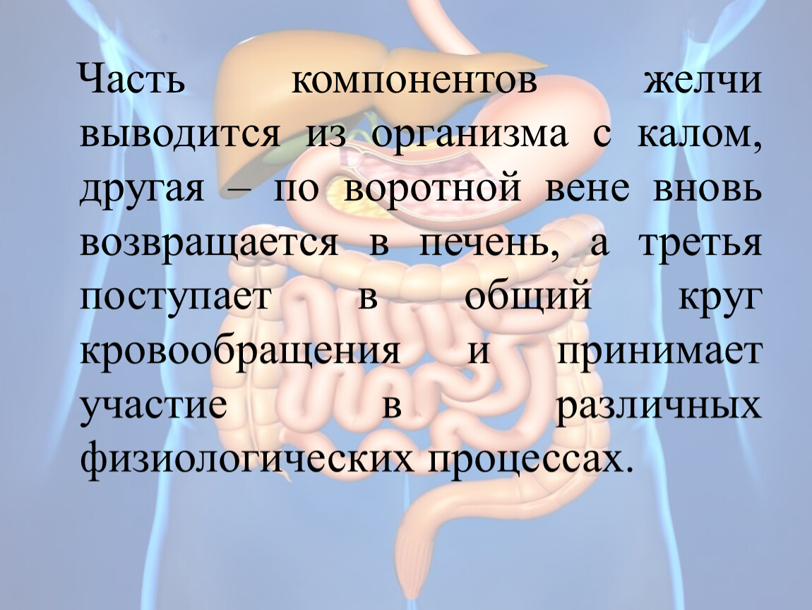 Часть компонентов желчи выводится из организма с калом, другая – по воротной вене вновь возвращается в печень, а третья поступает в общий круг кровообращения и принимает участие в различных физиологических процессах.
