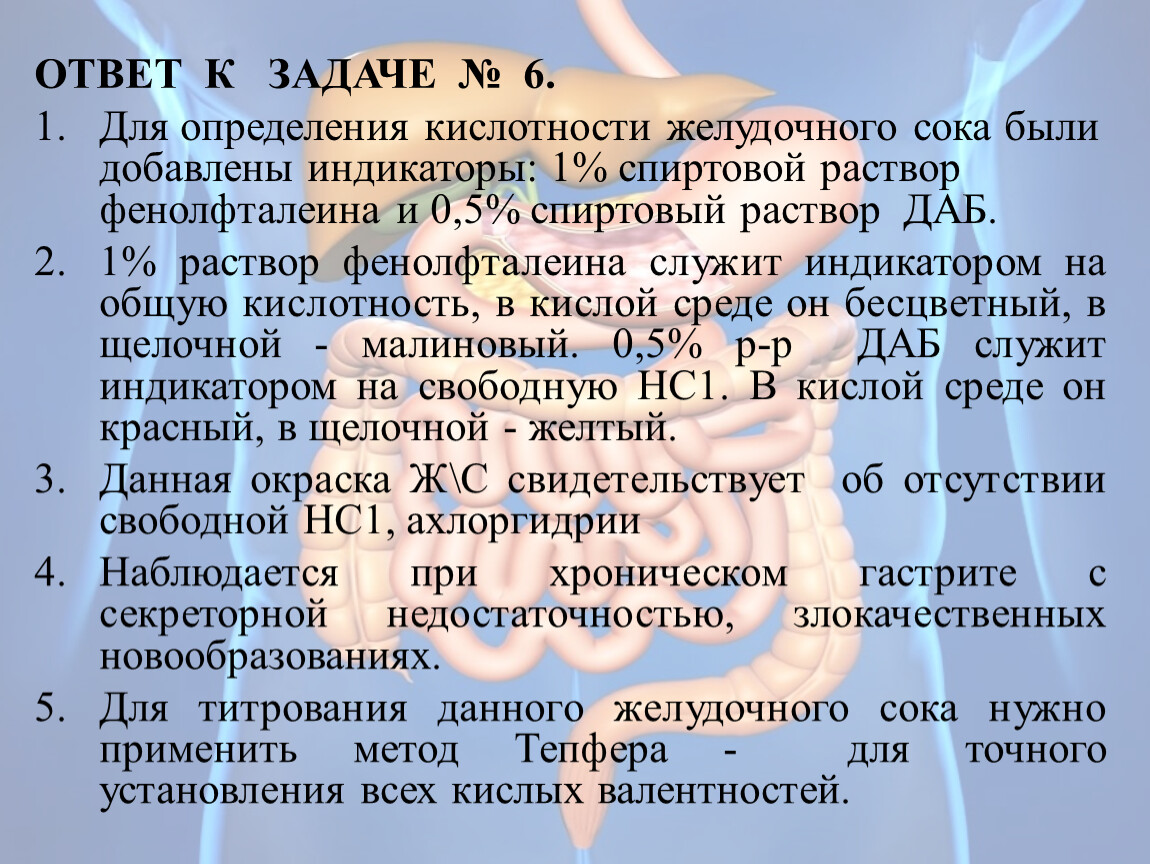 Для определения кислотности желудочного сока были добавлены индикаторы: 1% спиртовой раствор фенолфталеина и 0,5% спиртовый раствор ДАБ.
