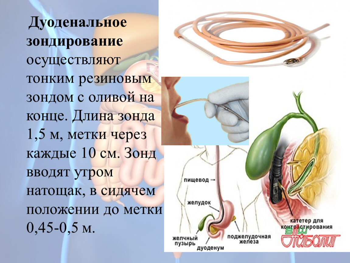 Дуоденальное зондирование осуществляют тонким резиновым зондом с оливой на конце. Длина зонда 1,5 м, метки через каждые 10 см. Зонд вводят утром натощак, в сидячем положении до метки 0,45-0,5 м.