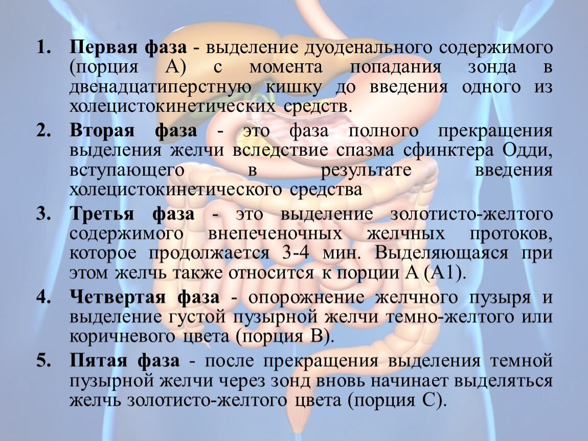 Первая фаза - выделение дуоденального содержимого (порция А) с момента попадания зонда в двенадцатиперстную кишку до введения одного из холецистокинетических средств.