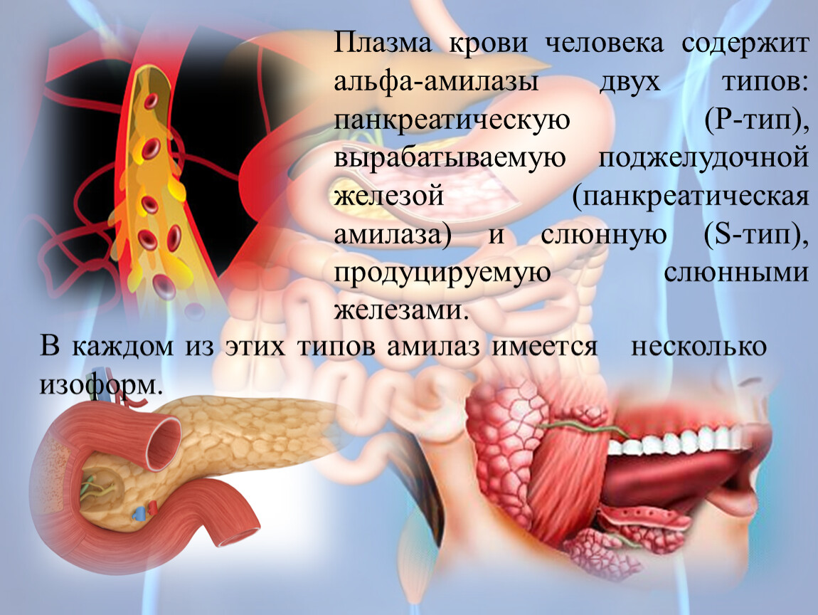 Плазма крови человека содержит альфа-амилазы двух типов: панкреатическую (Р-тип), вырабатываемую поджелудочной железой (панкреатическая амилаза) и слюнную (S-тип), продуцируемую слюнными железами.
