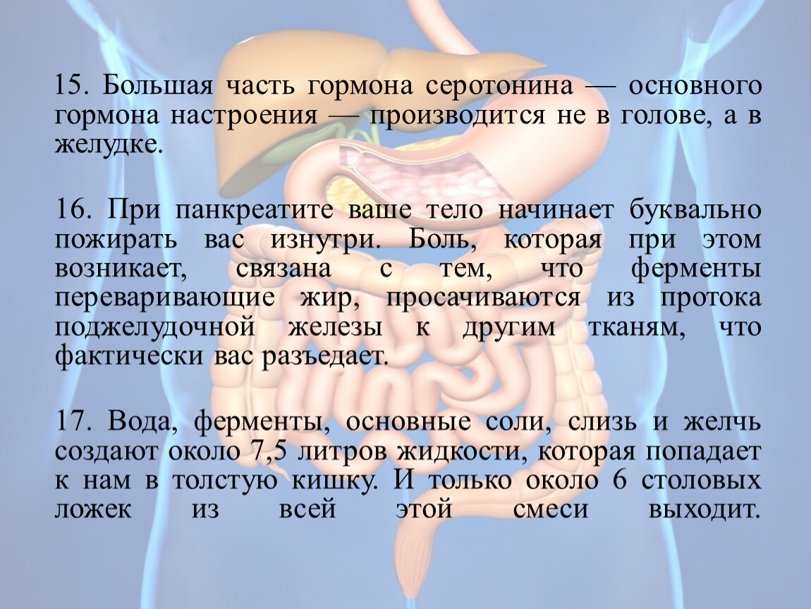 15. Большая часть гормона серотонина — основного гормона настроения — производится не в голове, а в желудке.