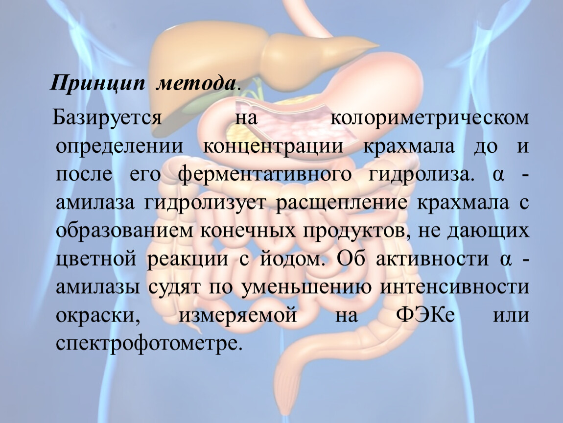Базируется на колориметрическом определении концентрации крахмала до и после его ферментативного гидролиза. α -амилаза гидролизует расщепление крахмала с образованием конечных продуктов, не дающих цветной реакции с йодом. Об активности α -амилазы судят по уменьшению интенсивности окраски, измеряемой на ФЭКе или спектрофотометре.