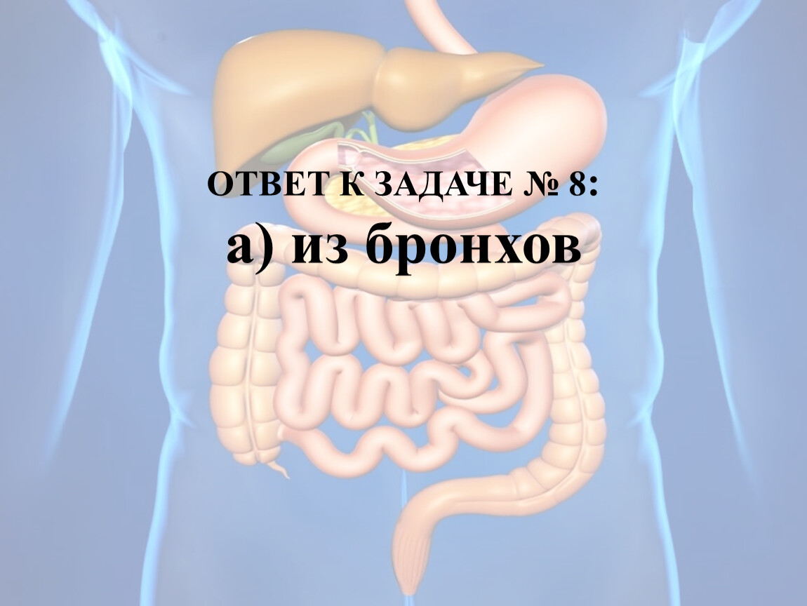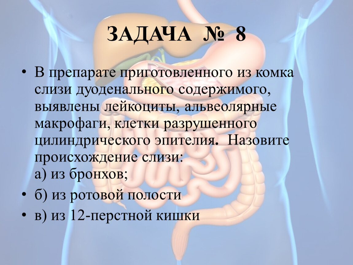 В препарате приготовленного из комка слизи дуоденального содержимого, выявлены лейкоциты, альвеолярные макрофаги, клетки разрушенного цилиндрического эпителия. Назовите происхождение слизи: а) из бронхов;