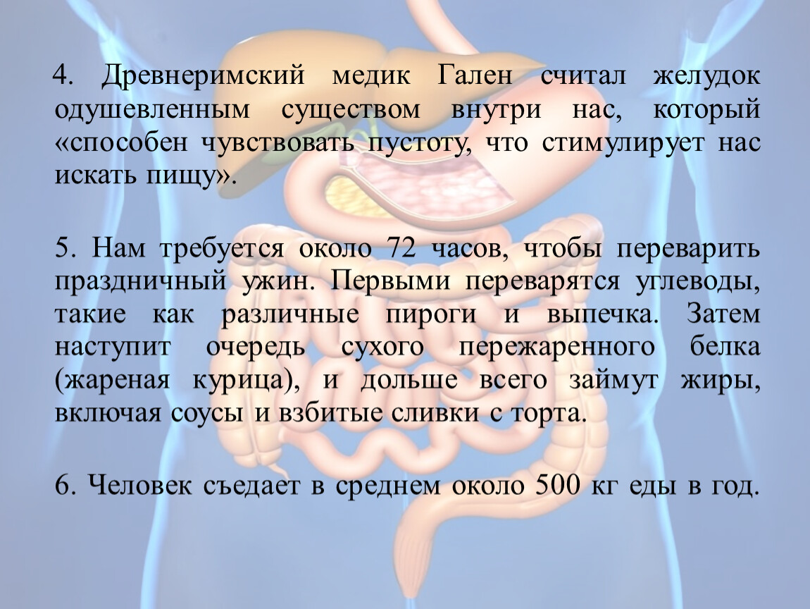 4. Древнеримский медик Гален считал желудок одушевленным существом внутри нас, который «способен чувствовать пустоту, что стимулирует нас искать пищу».