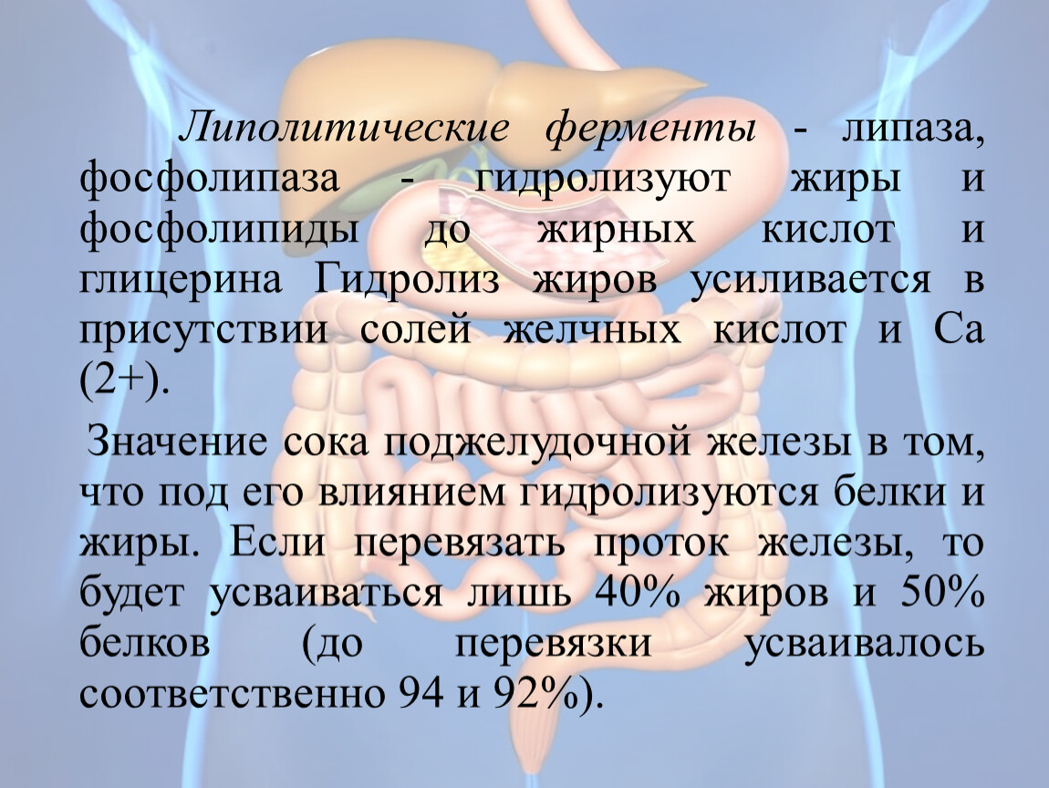 Липолитические ферменты - липаза, фосфолипаза - гидролизуют жиры и фосфолипиды до жирных кислот и глицерина Гидролиз жиров усиливается в присутствии солей желчных кислот и Са (2+).