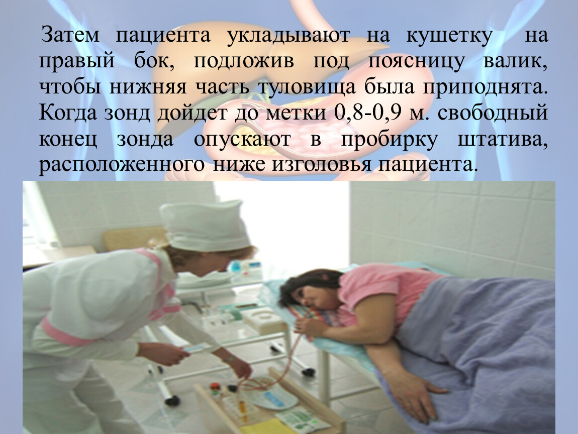 Затем пациента укладывают на кушетку на правый бок, подложив под поясницу валик, чтобы нижняя часть туловища была приподнята. Когда зонд дойдет до метки 0,8-0,9 м. свободный конец зонда опускают в пробирку штатива, расположенного ниже изголовья пациента.