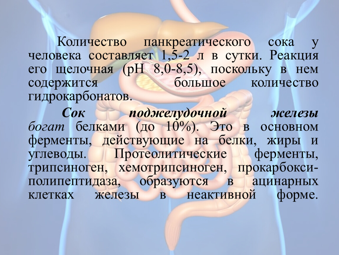 Количество панкреатического сока у человека составляет 1,5-2 л в сутки. Реакция его щелочная (рН 8,0-8,5), поскольку в нем содержится большое количество гидрокарбонатов.