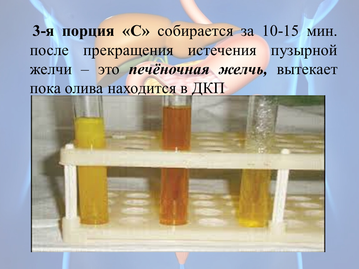 3-я порция «С» собирается за 10-15 мин. после прекращения истечения пузырной желчи – это печёночная желчь, вытекает пока олива находится в ДКП
