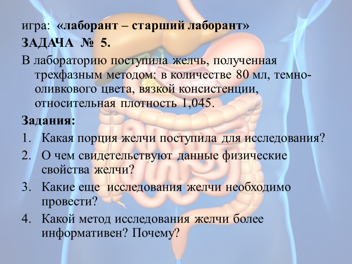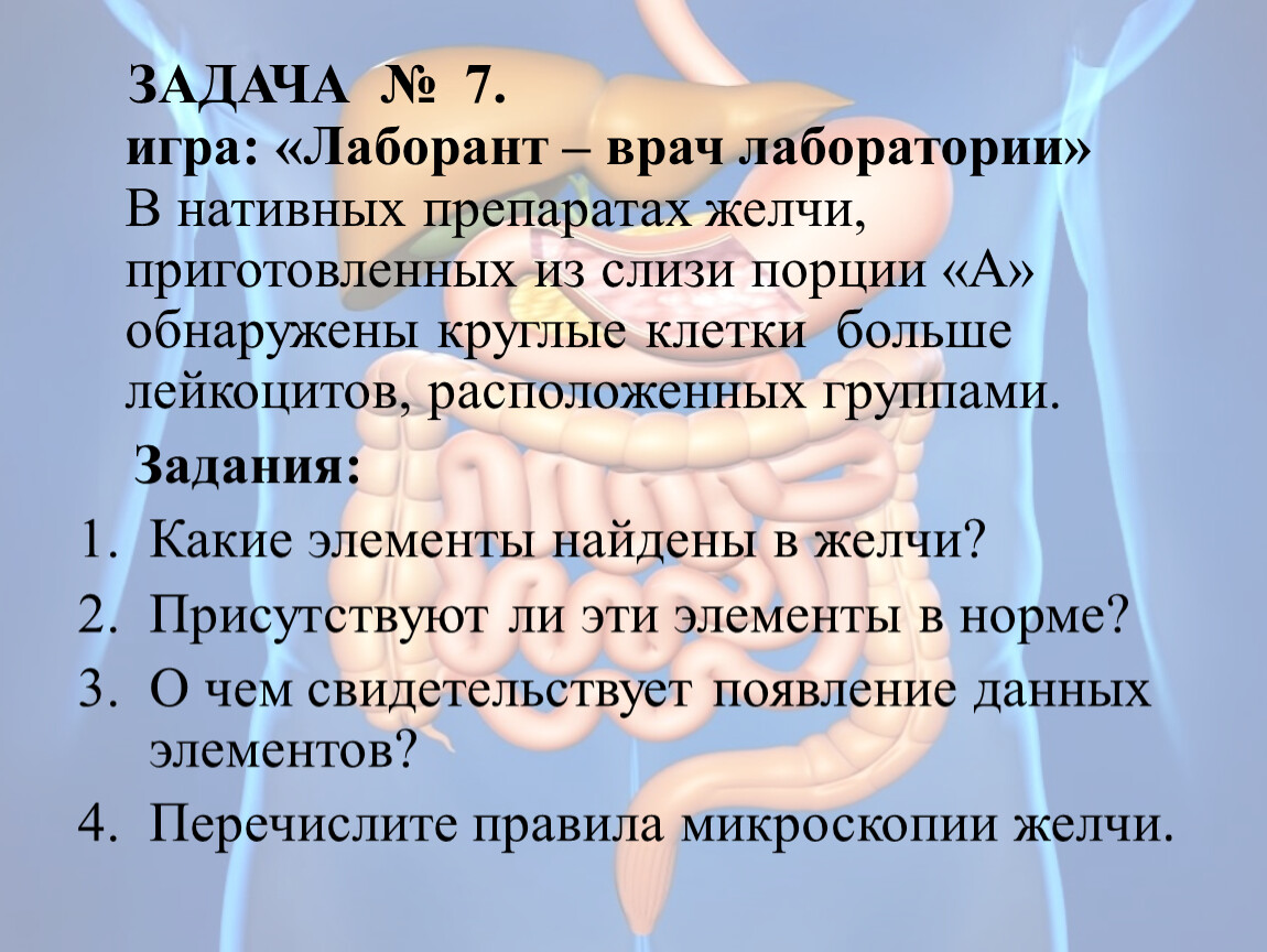 ЗАДАЧА № 7. игра: «Лаборант – врач лаборатории» В нативных препаратах желчи, приготовленных из слизи порции «А» обнаружены круглые клетки больше лейкоцитов, расположенных группами.