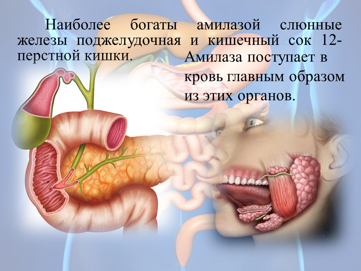 Наиболее богаты амилазой слюнные железы поджелудочная и кишечный сок 12-перстной кишки.