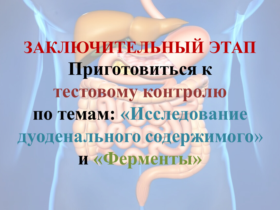 ЗАКЛЮЧИТЕЛЬНЫЙ ЭТАП Приготовиться ктестовому контролю по темам: «Исследование дуоденального содержимого» и «Ферменты»