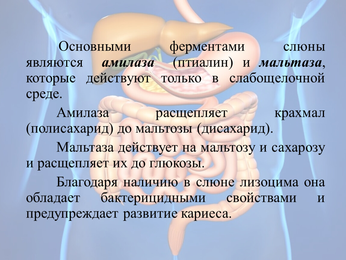 Основными ферментами слюны являются амилаза (птиалин) и мальтаза, которые действуют только в слабощелочной среде.