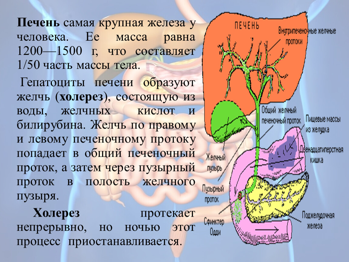 Печень самая крупная железа у человека. Ее масса равна 1200—1500 г, что составляет 1/50 часть массы тела.