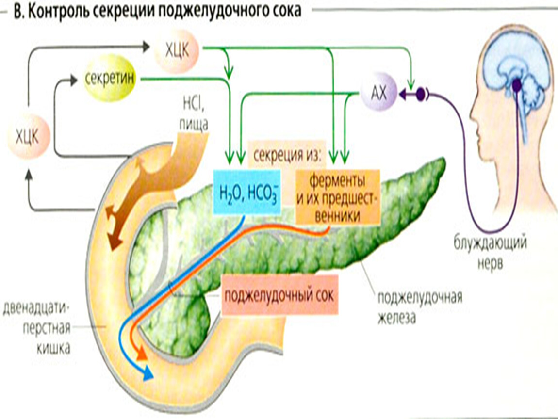 Внешнесекреторная активность направлена на синтез пищеварительных ферментов, секрецию бикарбонатов, ионов натрия, хлора и калия. У здорового человека в сутки выделяется 1,5-3 л панкреатического сока с рН 8,0.