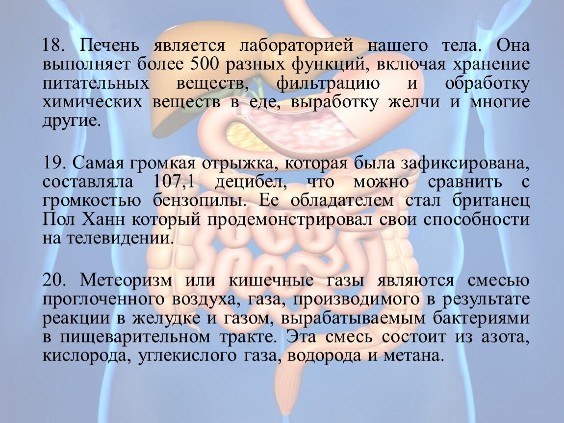 20. Метеоризм или кишечные газы являются смесью проглоченного воздуха, газа, производимого в результате реакции в желудке и газом, вырабатываемым бактериями в пищеварительном тракте. Эта смесь состоит из азота, кислорода, углекислого газа, водорода и метана.