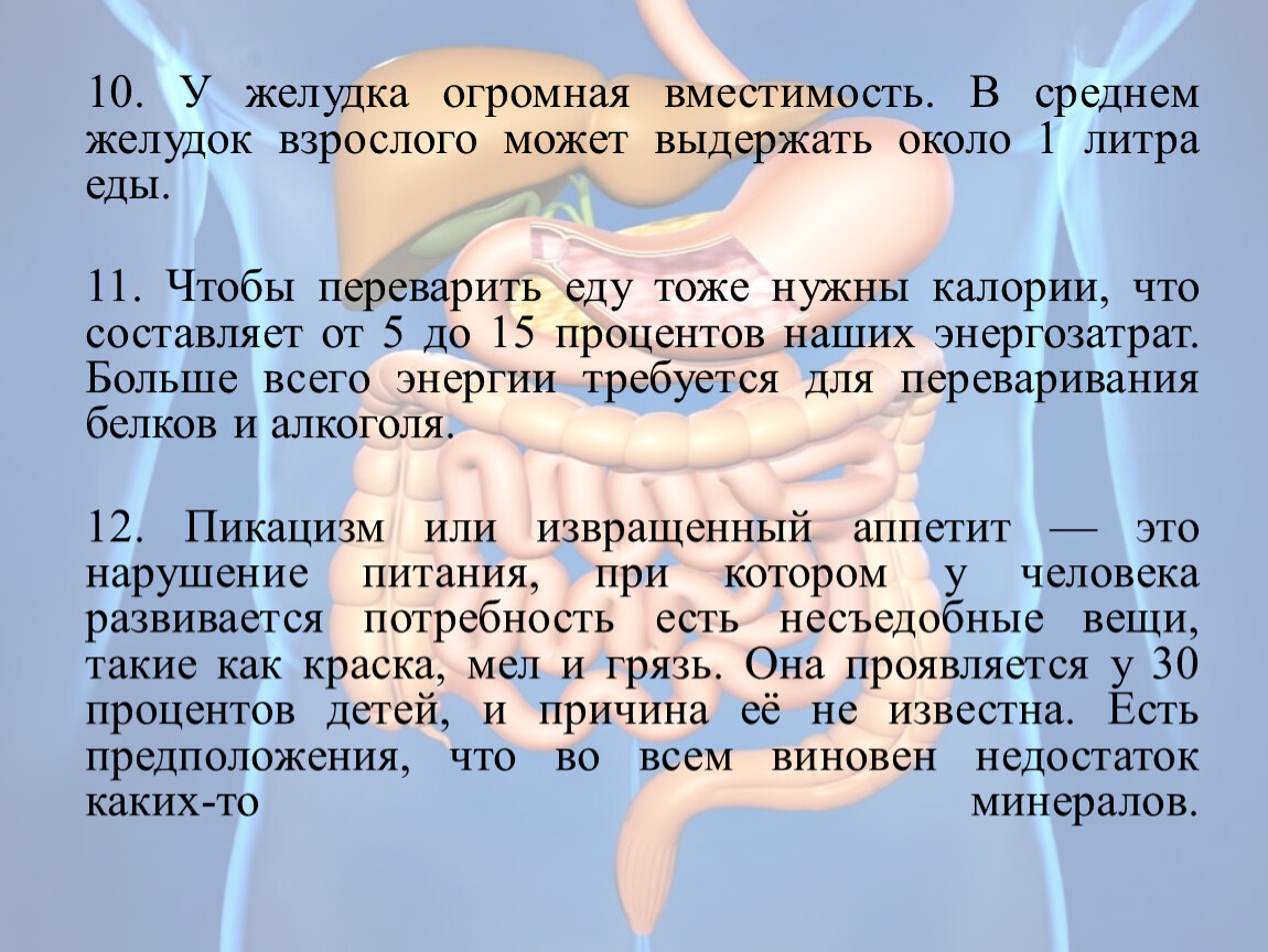 10. У желудка огромная вместимость. В среднем желудок взрослого может выдержать около 1 литра еды.