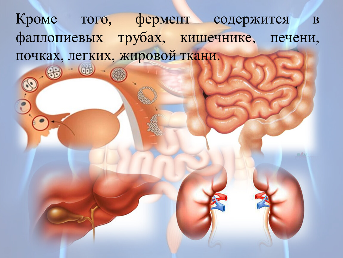 Кроме того, фермент содержится в фаллопиевых трубах, кишечнике, печени, почках, легких, жировой ткани.