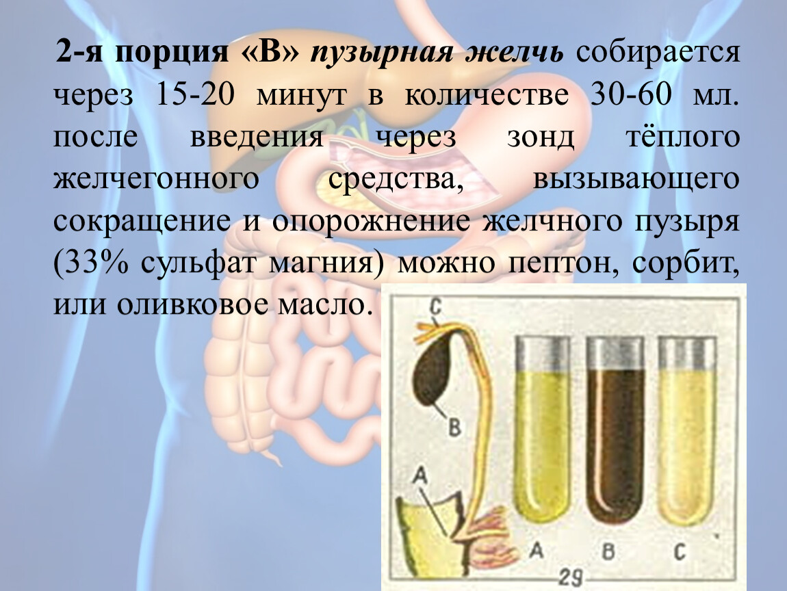 2-я порция «В» пузырная желчь собирается через 15-20 минут в количестве 30-60 мл. после введения через зонд тёплого желчегонного средства, вызывающего сокращение и опорожнение желчного пузыря (33% сульфат магния) можно пептон, сорбит, или оливковое масло.