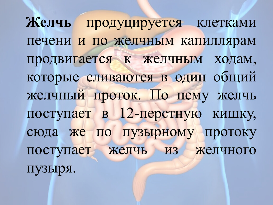 Желчь продуцируется клетками печени и по желчным капиллярам продвигается к желчным ходам, которые сливаются в один общий желчный проток. По нему желчь поступает в 12-перстную кишку, сюда же по пузырному протоку поступает желчь из желчного пузыря.