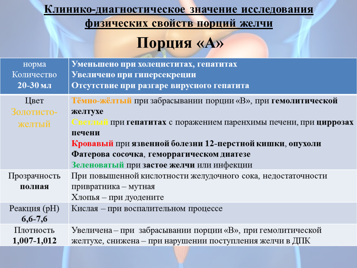Она представляет собой смесь желчи, секретов поджелудочной железы, двенадцатиперстной кишки и небольшого количества желудочного сока. Порция «А» собирается в течение 10-20 минут, в количестве 25-35 мл