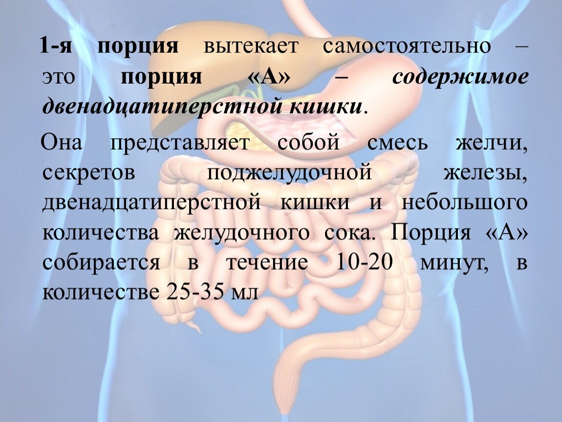 1-я порция вытекает самостоятельно – это порция «А» – содержимое двенадцатиперстной кишки.