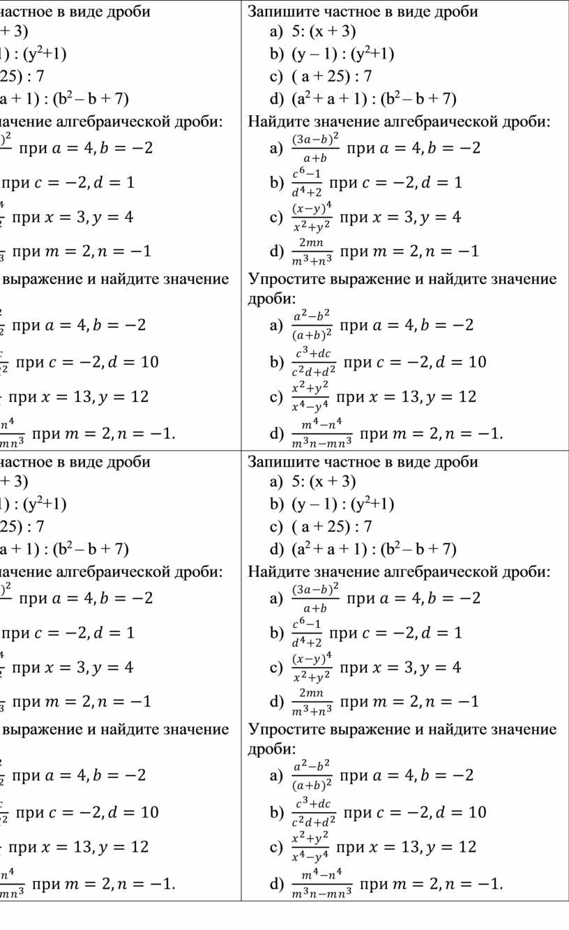 Запишите частное в виде дроби a) 5: (х + 3) b) (у – 1) : (у2+1) c) ( а + 25) : 7 d) (а2 + а + 1) : (b2 – b + 7) Найдите значение алгебраической дроби: a)