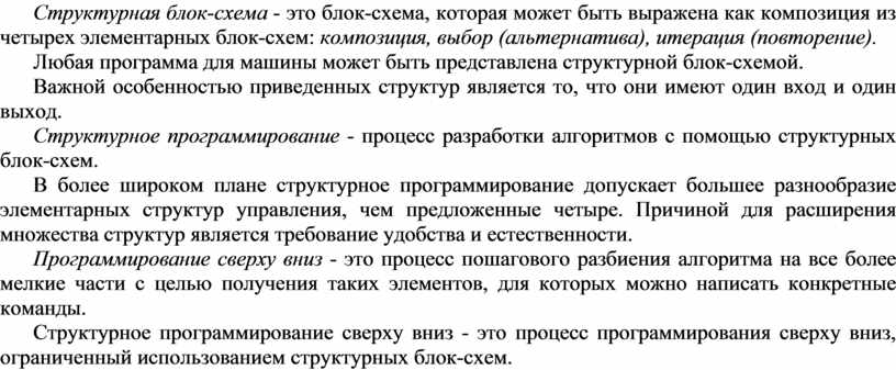 Структурное программирование - процесс разработки алгоритмов с помощью структурных блок-схем.