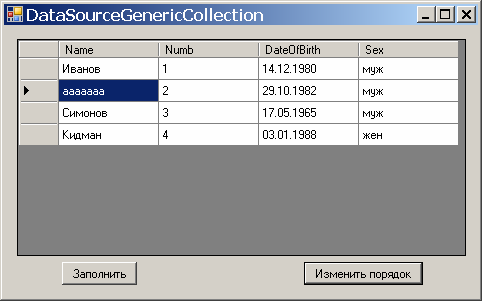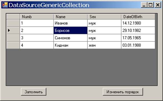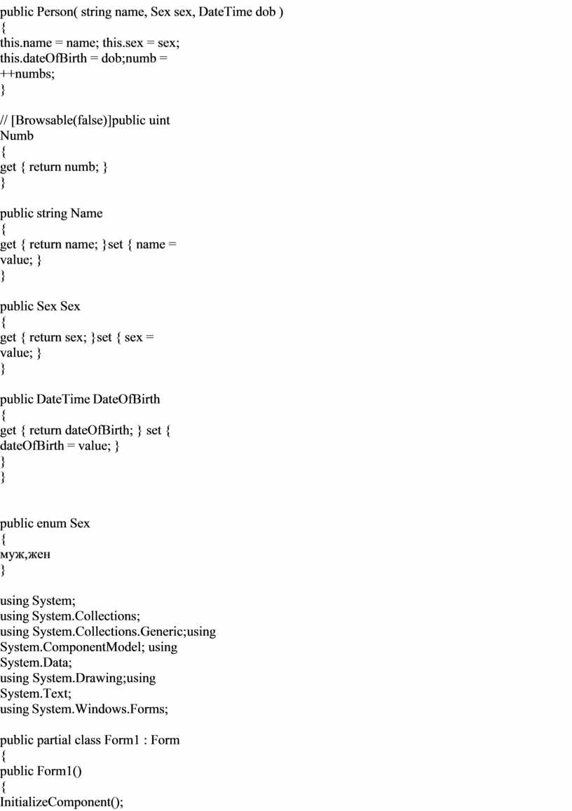 people.Add (new Person("Иванов", Sex.муж, new DateTime(1980, 12, 14))); people.Add(new Person("Борисов", Sex.муж, new DateTime(1982, 10, 29))); people.Add (new Person("Симонов", Sex.муж, new DateTime(1965, 5, 17))); people.Add (new Person("Кидман", Sex.жен, new DateTime(1988, 1, 3)));