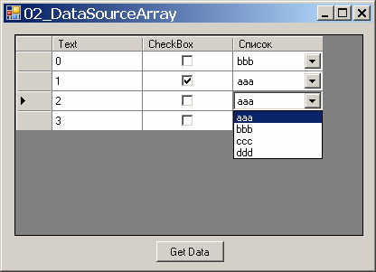 Комбинированный список является общим для всех ячеек столбца DataGridViewComboBoxColumn. Поэтому в качестве источника данных для такого столбца может использоваться массив объектов. Имя массива необходимо указать в свойстве DataSource столбца DataGridViewComboBoxColumn.