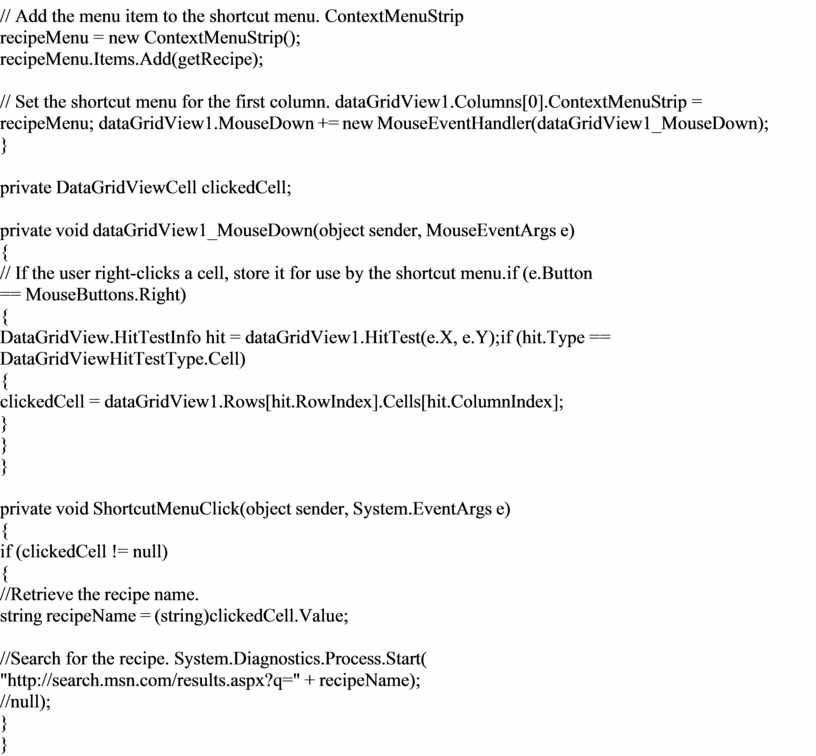 // Set the shortcut menu for the first column. dataGridView1.Columns[0].ContextMenuStrip = recipeMenu; dataGridView1.MouseDown += new MouseEventHandler(dataGridView1_MouseDown);