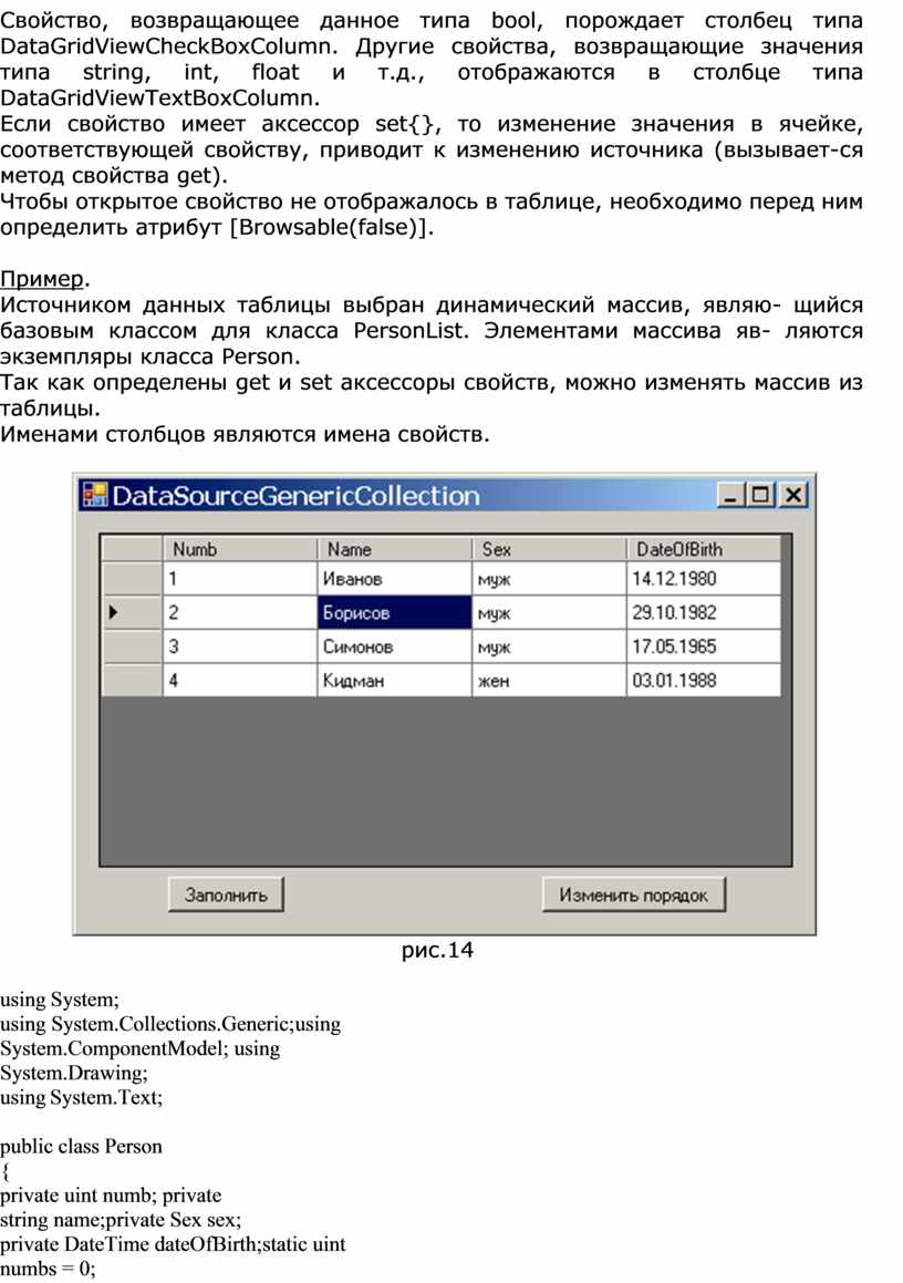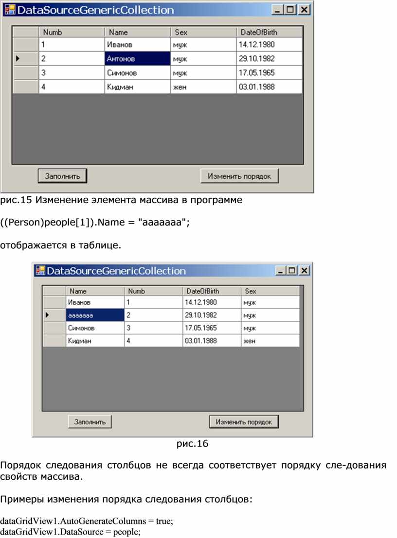 Когда в качестве источника используется массив, то ЭУ DataGridView ищет подходящие открытые свойства и создает из них столбцы и строки: имена свойств становятся именами столбцов, а значения свойств – зна- чениями ячеек.