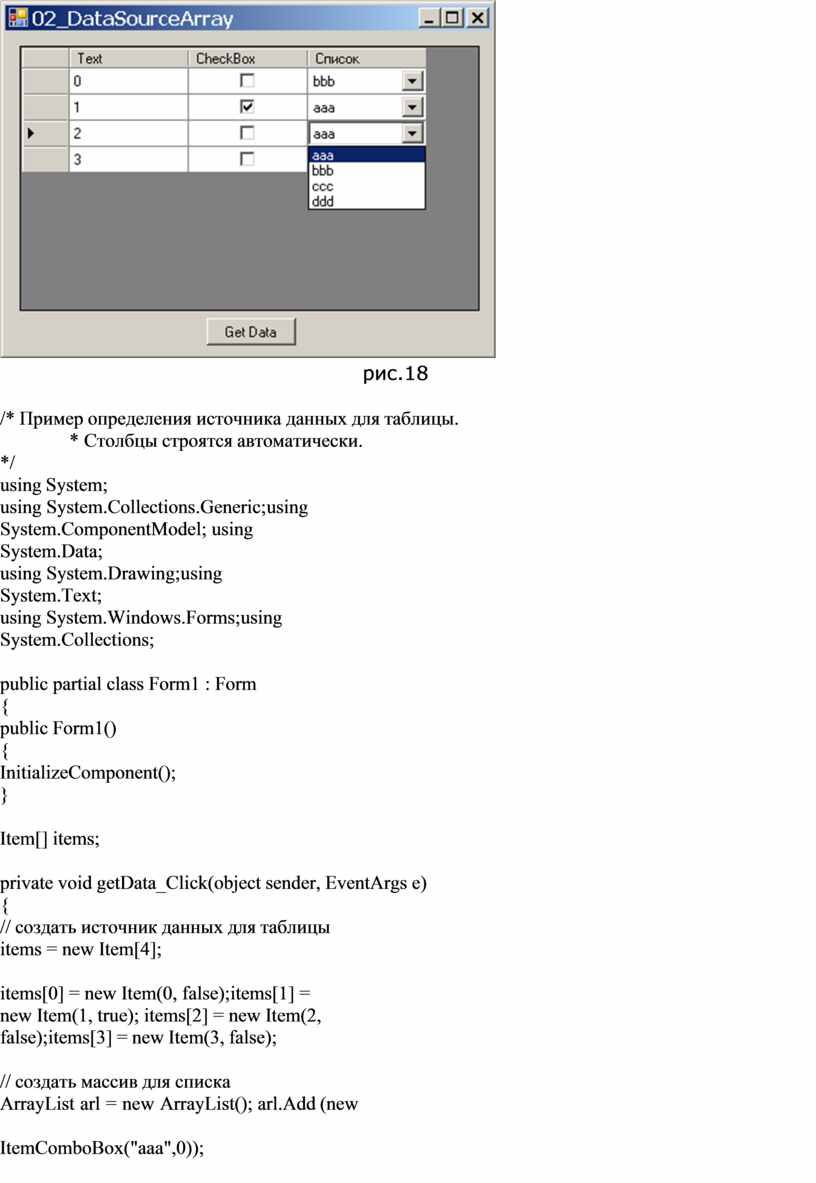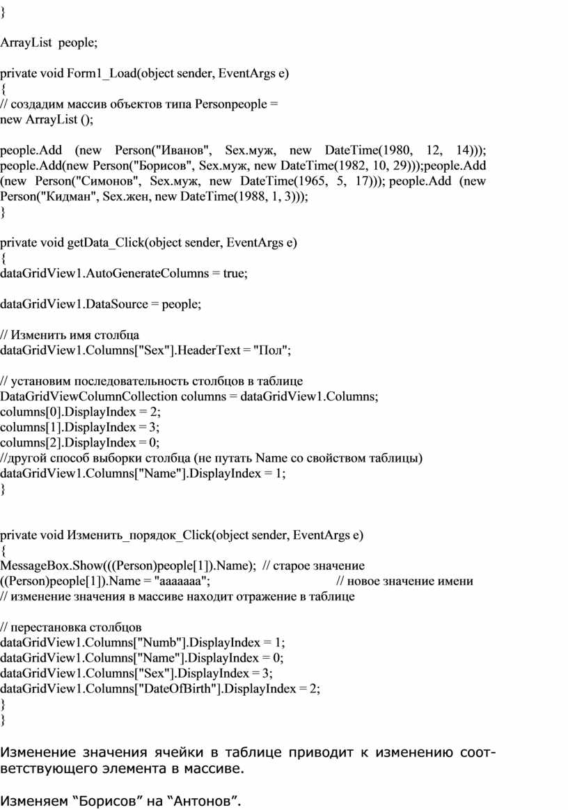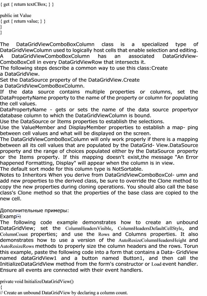 Если объект массива содержит несколько открытых свойств, то необ- ходимо в DisplayMember указать, какое свойство является отображае- мым, а в ValueMember - какое свойство возвращает значение в програм- му. Свойство DataPropertyName указывает имя свойства в источнике данных таблицы, которое является индексом в списке.