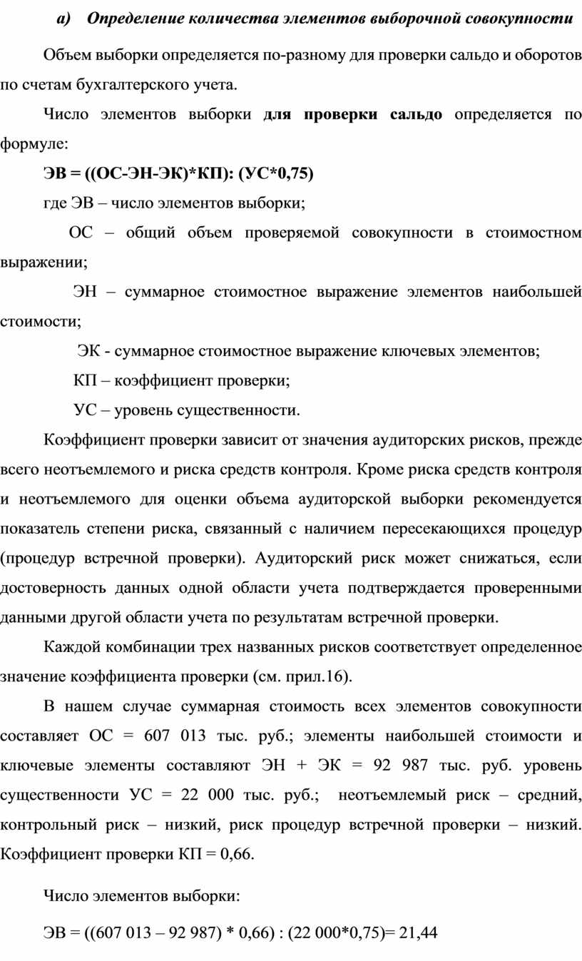 В нашем случае суммарная стоимость всех элементов совокупности составляет ОС = 607 013 тыс. руб.; элементы наибольшей стоимости и ключевые элементы составляют ЭН + ЭК = 92 987 тыс. руб. уровень существенности УС = 22 000 тыс. руб.; неотъемлемый риск – средний, контрольный риск – низкий, риск процедур встречной проверки – низкий. Коэффициент проверки КП = 0,66.