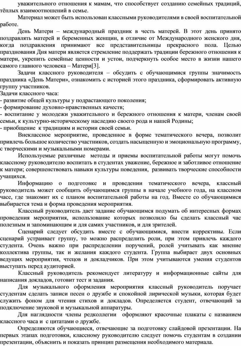 Используемые различные методы и приемы воспитательной работы могут помочь классному руководителю воспитать в студентах уважение, бережное и заботливое отношение к матери; совершенствовать навыки культуры поведения, развивать творческие способности учащихся.