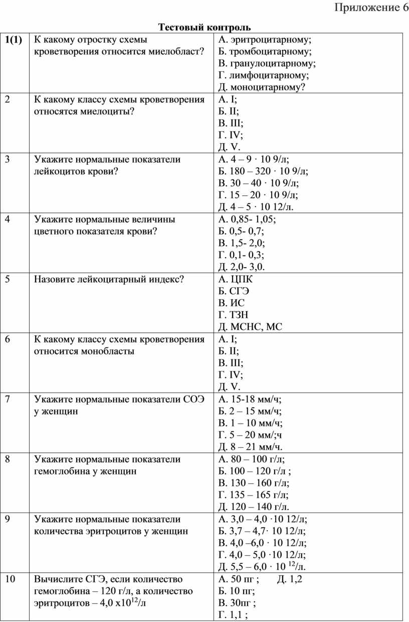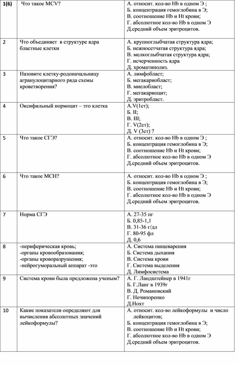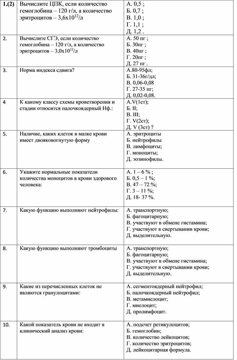 A. 3,0 – 4,0 ·10 12/л; Б. 3,5 – 4,0· 10 12/л; В. 7,0 –8,0 · 10 12/л; Г. 4,5 – 5,5 ·10 12/л; Д. 5,5 – 6,0 · 10 12/л. |