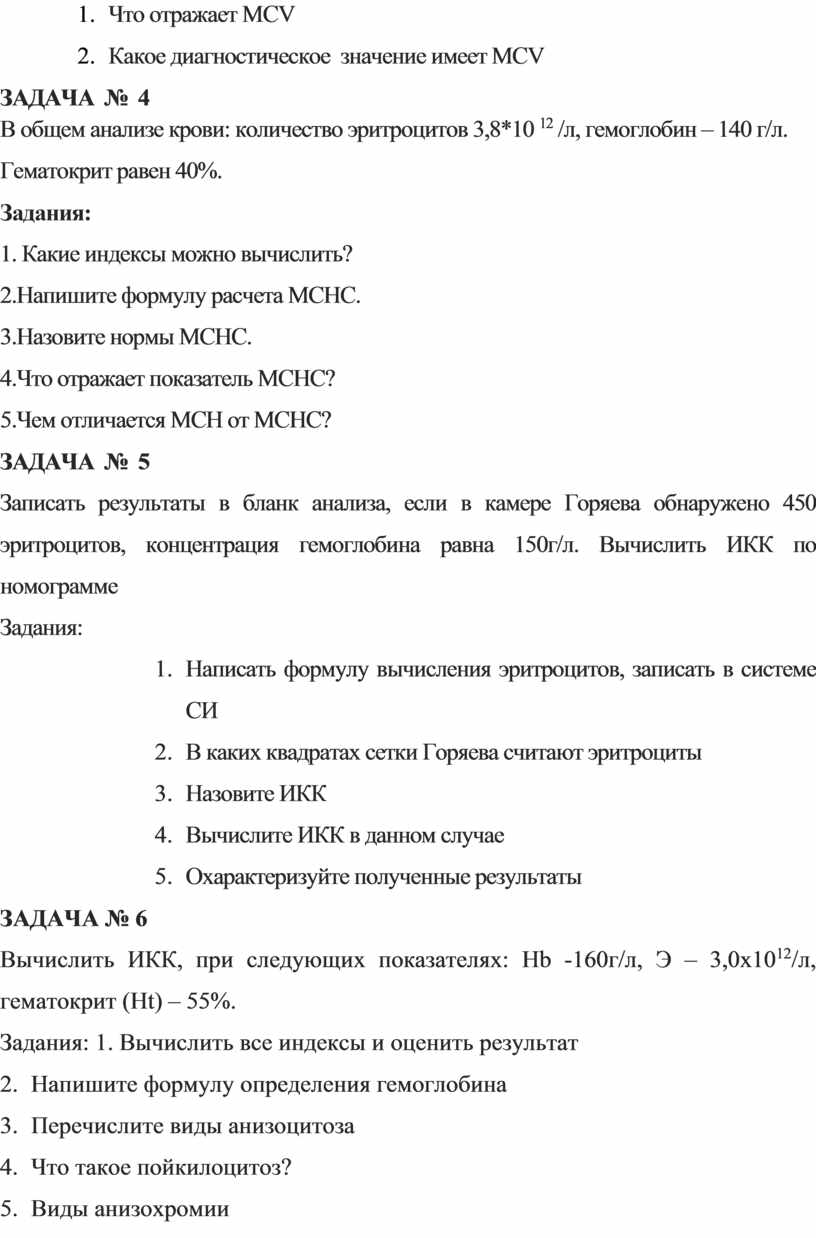 A. содержание лейкоцитов в 1 л крови; Б. концентрация гемоглобина в Э; В. соотношение Нb и Ht крови; Г. абсолютное кол-во Нb в одном Э Д.средний объем эритроцитов.