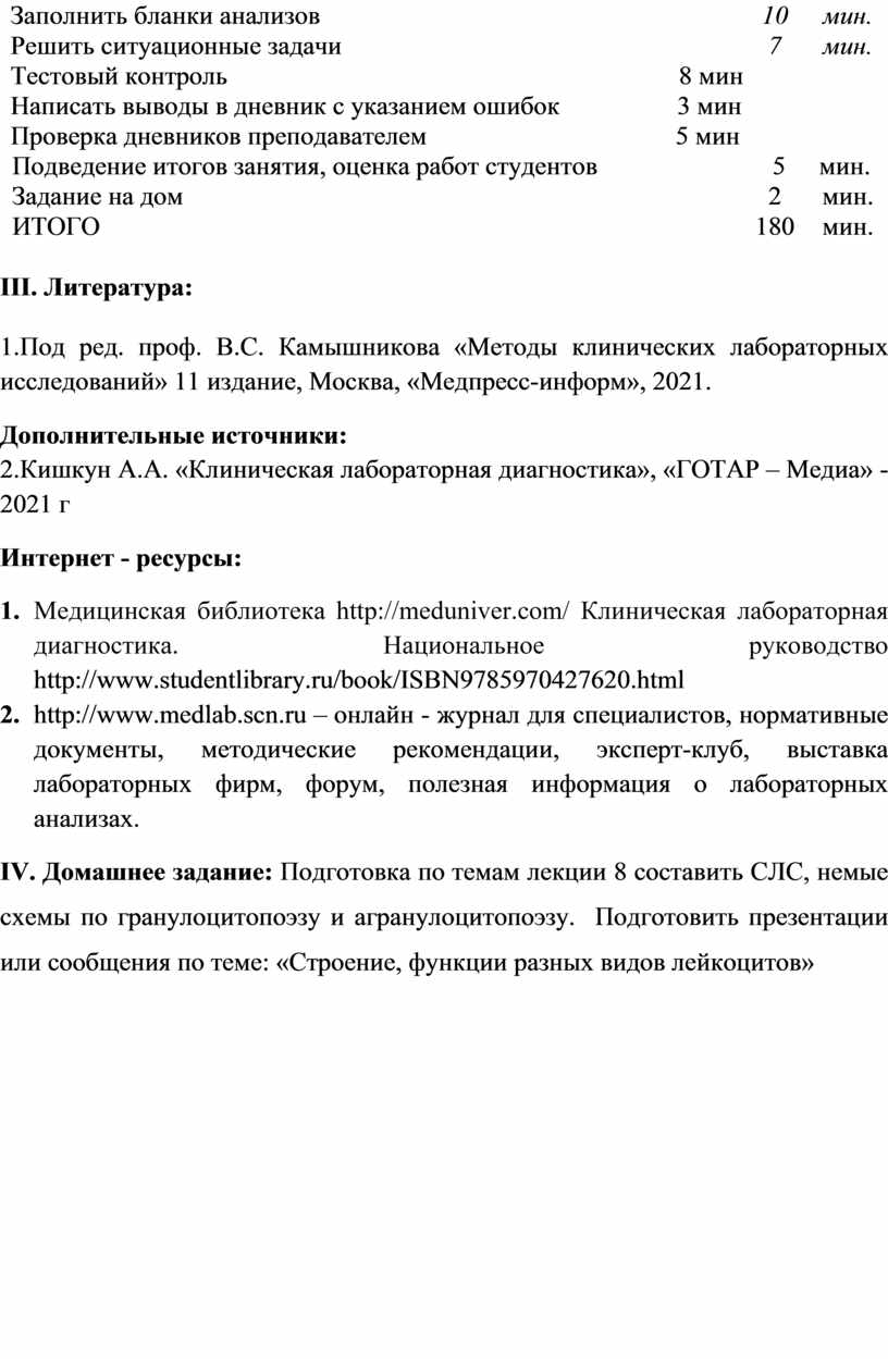 Литература: «Методы клинических лабораторных исследований» //Под ред. проф. В.С. Камышникова и соавт.,/11 изд, Москва,«Медпресс-информ», 2021г.