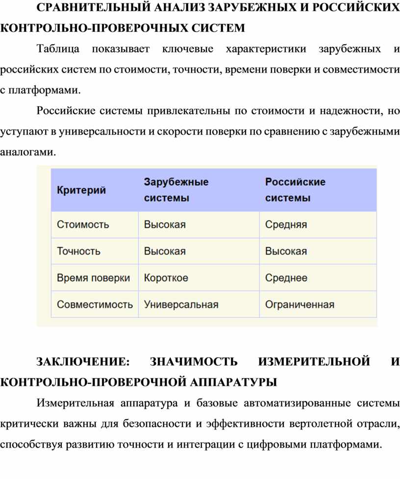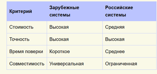 Таблица показывает ключевые характеристики зарубежных и российских систем по стоимости, точности, времени поверки и совместимости с платформами.