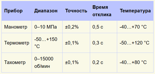 Диапазон, точность, время отклика и рабочая температура для манометров, термометров и тахометров.
