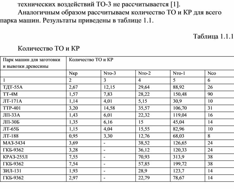 Аналогичным образом рассчитываем количество ТО и КР для всего парка машин. Результаты приведены в таблице 1.1.
