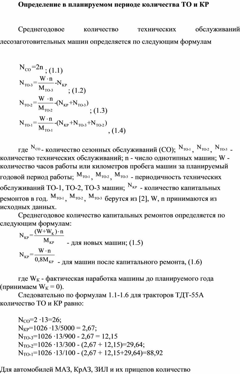Следовательно по формулам 1.1-1.6 для тракторов ТДТ-55А количество ТО и КР равно: