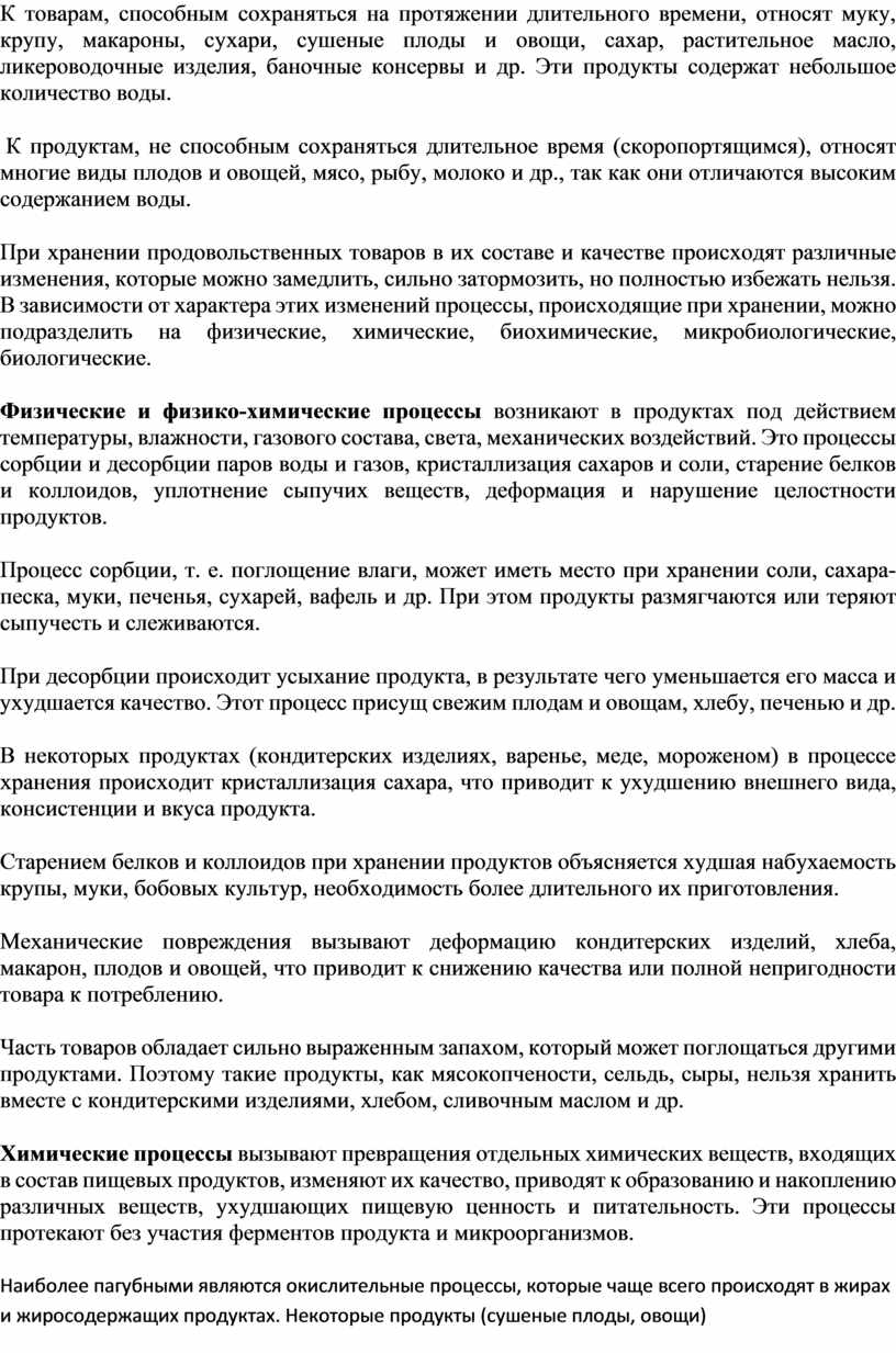 При хранении продовольственных товаров в их составе и качестве происходят различные изменения, которые можно замедлить, сильно затормозить, но полностью избежать нельзя. В зависимости от характера этих изменений процессы, происходящие при хранении, можно подразделить на физические, химические, биохимические, микробиологические, биологические.