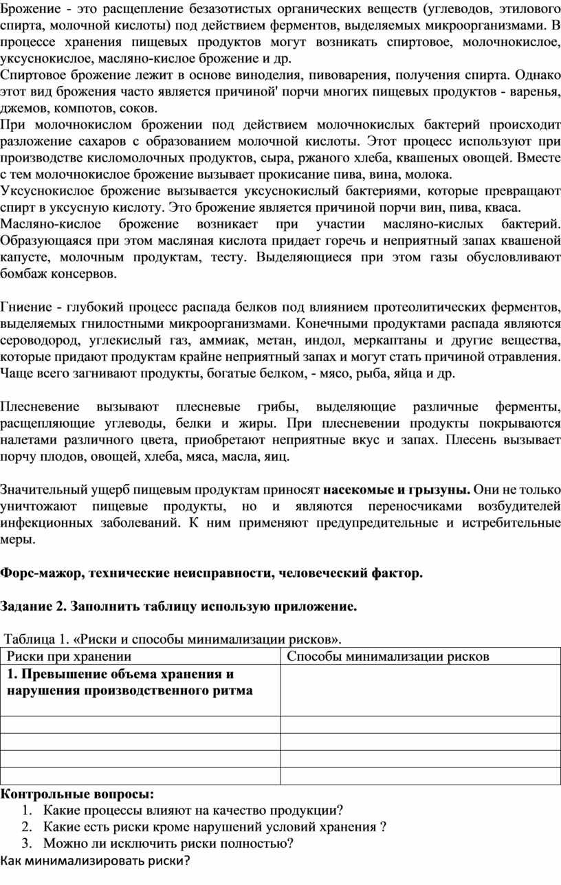 1. Изучить основные риски при хранении и процессы вызывающие потерю качества сырья.