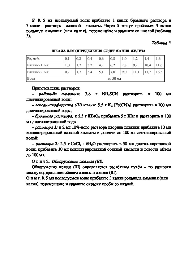 О п ы т. К 5 мл исследуемой воды прибавьте 3 капли роданида аммония (или