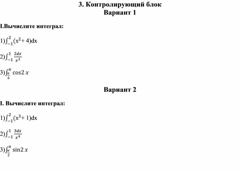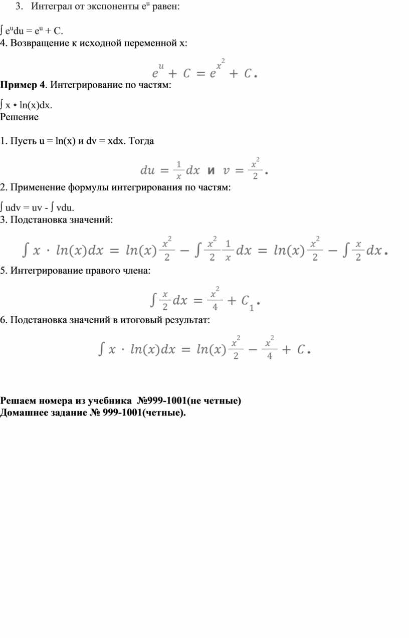 3. Интегрирование по частям: если u=u(x) и v=v(x) — две функции, то интеграл ∫ udv можно вычислить по формуле: