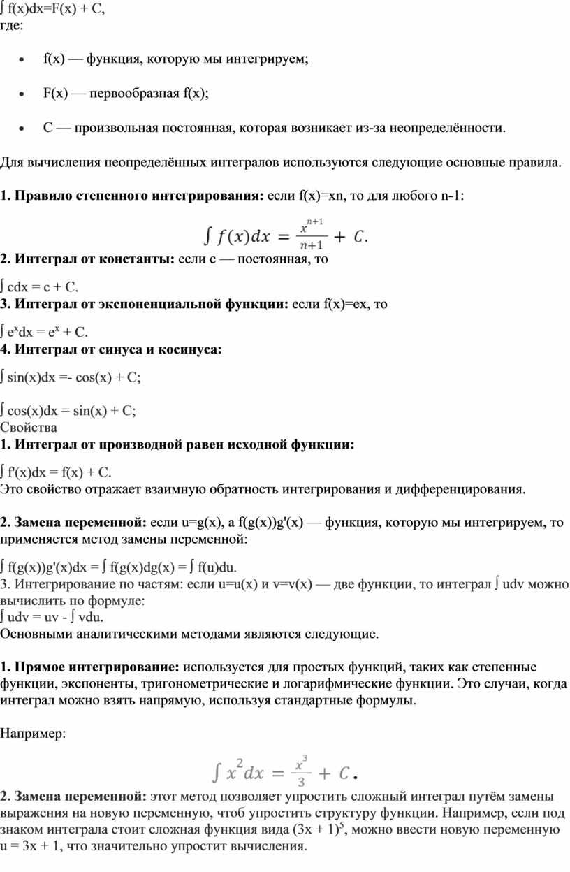 Неопределённый интеграл — это интеграл, который не имеет конкретных границ и представляет собой общее семейство функций. Результатом вычисления неопределённого интеграла является первообразная, то есть функция, производная от которой равна исходной функции. Неопределённый интеграл записывается без указания пределов интегрирования и включает в себя постоянную интегрирования C, поскольку дифференцирование любой константы равно нулю.